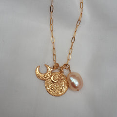This multi charm necklace is a must have everyday necklace for layering and adding that touch of understated glamour to your outfit. Featuring a crescent moon charm edged in delicate granulation, a hand etched night's sky coin with tiny stars and a little moon and a beautiful pink hand wired freshwater pearl. The iridescent lustre of the candy floss pink pearl perfectly balances out the 18ct yellow gold charms. The charms move freely on a medium open link trace chain and the necklace secures with a lobster clasp. A little etched shooting star charm features at the reverse of the necklace, a finishing touch to the back of the necklace.